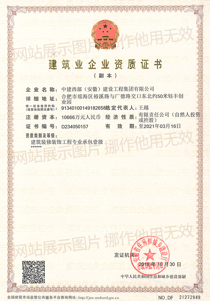 2018年10月,米兰在线开户顺利地通过了米兰(中国)企业资质的审查,是公司继米兰(中国)施工总承包壹级、市政公用工程施工总承包叁级资质之后,取得了建筑装修装饰工程专业承包壹级资质。