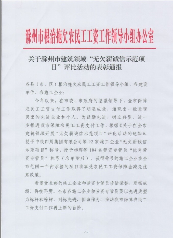 近日,喜报连连,米兰在线开户集团承建滁州奥特莱斯仪邦项目获评滁州市建筑领域“无欠薪诚信示范项目”。滁州市根治拖欠农民工工资工作领导小组办公室印发《关于滁州市建筑领域“无欠薪诚信示范项目”评比活动的表彰通报》,对我司获评进行了表彰通报。