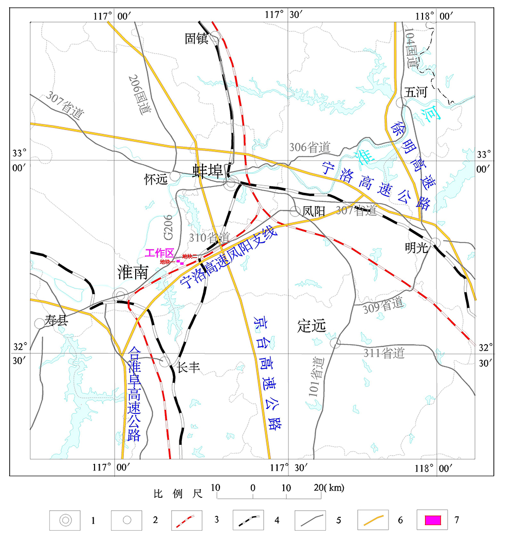 工作区铁路、公路交通便利,工作区南侧有合蚌客运专线(高铁)与宁洛高速凤阳支线通过,东缘有京台高速公路通过,区内有简易公路连接凤(阳)~淮(南)(310省道)与国道206主干公路。(图1-1)