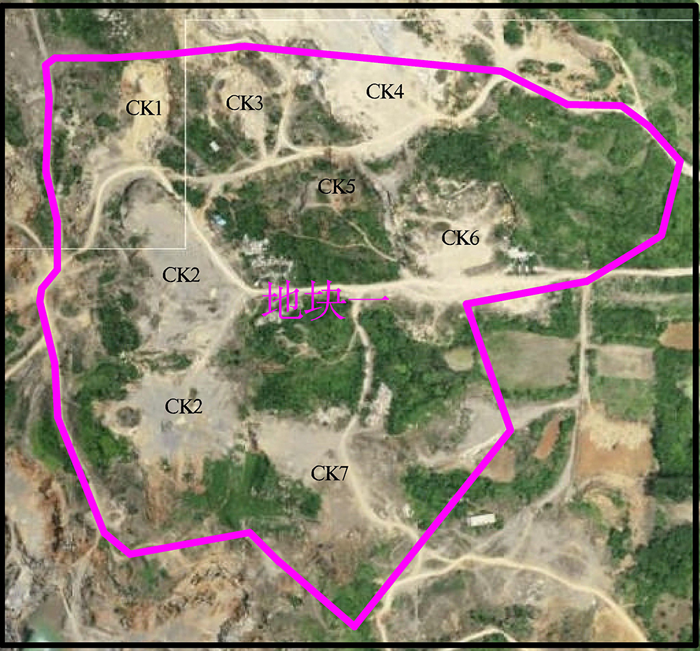 1、地块一东西长约423米、南北宽约400米,面积0.1200平方千米,整体地势西高东底,地面标高约76~129m,。地块一范围内共有CK1、CK2、CK3、CK4、CK5、CK6、CK7,七个历史采坑。(图1-2)