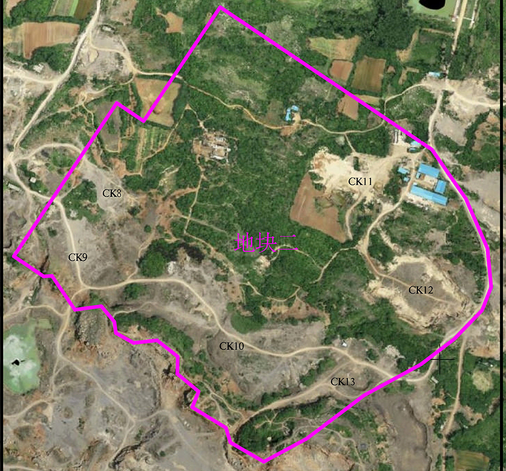 2、地块二东西长约655米、南北宽约630米,面积0.2320平方千米,整体地势南高北底,地面标高约64~152m。地块二范围内共有CK8、CK9、CK10、CK11、CK12、CK13,六个历史采坑。(图1-3)
