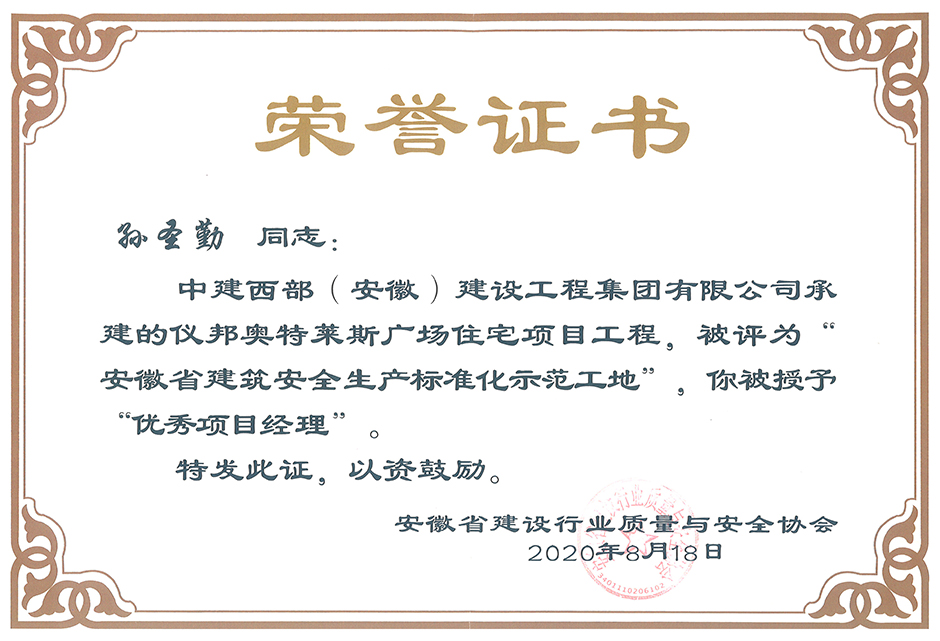 近日,喜报连连,米兰在线开户建设集团滁州仪邦奥特莱斯广场住宅项目同时荣获安徽省建设行业质量与安全协会、滁州市住房和城乡建设局颁发的“安徽省建筑安全生产标准化示范工地”与“滁州市建筑施工安全质量标准化示范工地”称号。项目经理孙圣勤同志被授予“优秀项目经理”。